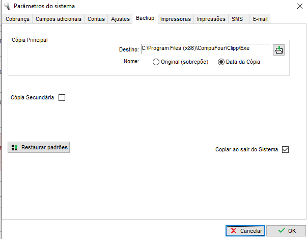 O ClippMEI, possui uma eficiente ferramenta para realizar o backup (cópia de segurança) dos dados. No arquivo de backup gerado estão todos os arquivos referentes ao banco de dados e configurações. Nessa aba é possível realizar a respectiva configuração do backup. Atualmente o backup pode ser realizado em dois locais diferentes, basta efetuar a configuração primeiramente na cópia principal e após na cópia secundária.