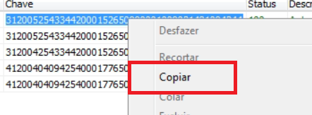 Para consultar NFC-e autorizada, no Emissor de NFC-e, pressione a tecla F7 e localize a NFC-e que pretende consultar, clique 3 vezes rapidamente sobre a chave de acesso, em seguida, clique com o botão direito e vá até a opção Copiar.