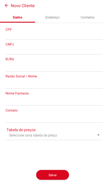Na aba de cadastro de clientes, será necessário informar todos os dados nas telas abaixo, clicando nas respectivas abas.