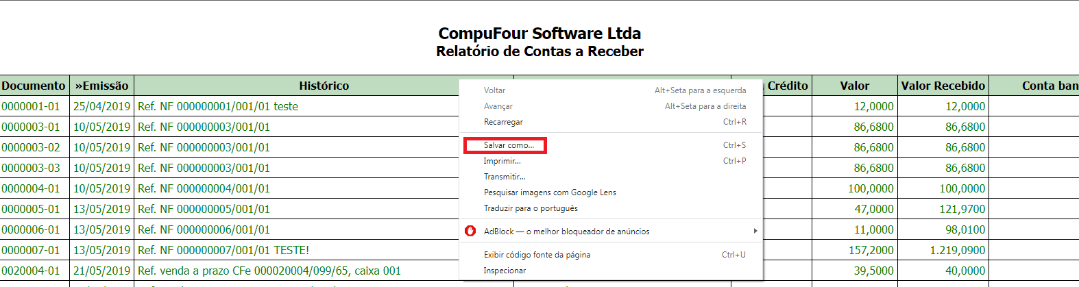 Caso queira exportar dados de outros módulos, acesse o módulo específico e pressione a tecla F7! Será gerado em tela um HTML contendo as informações da grid, caso queira salvar, clique com o botão direito do mouse na tela - salvar como;