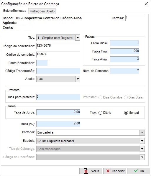 ATENÇÃO: Os procedimentos aqui descritos são apenas um MODELO, o Banco é quem deve acompanhar no preenchimento dos campos para correta configuração! Qualquer campo que deixar em branco poderá afetar os resultados, é importante verificar com o Banco o que preencher em cada campo!