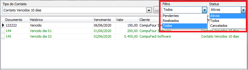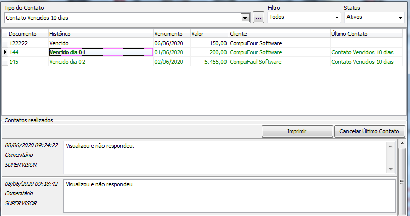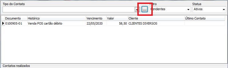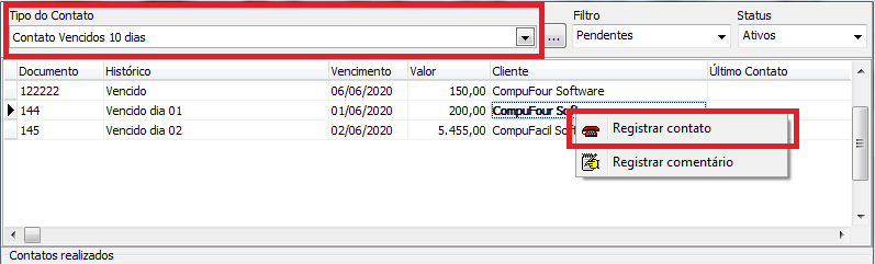 Após gravar o filtro, ao selecionar na tela inicial do gerenciador de cobranças, será carregado os resultados abaixo, clique com o botão direito no contato que deseja gravar e em seguida clique no botão Registrar Contato.