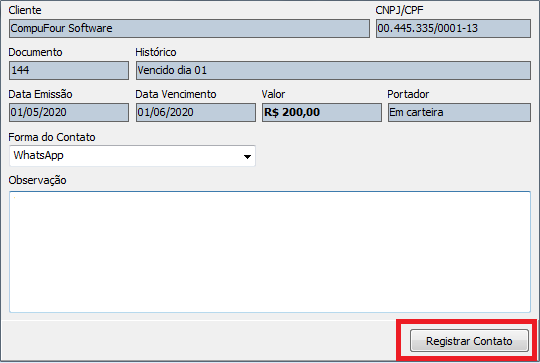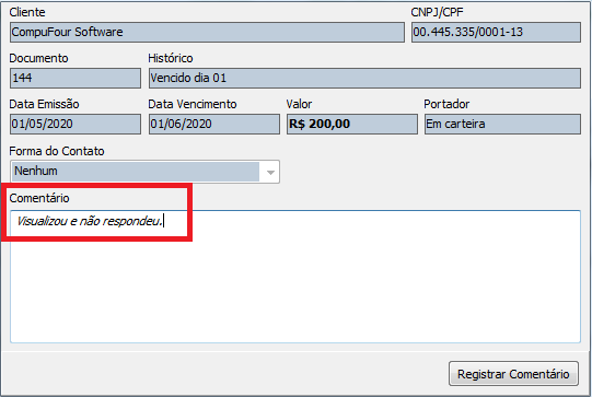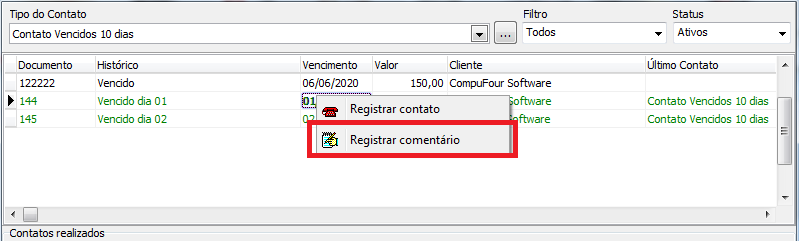 Para adicionar um comentário sobre o contato, clique com o botão direito e em seguida clique na opção Registrar Comentário.