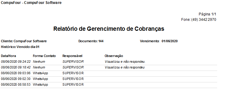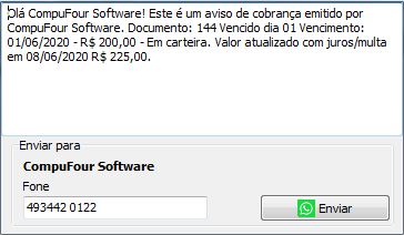 Abrirá a tela para digitação do texto de cobrança, no campo Fone será carregado o número registrado no campo Celular/0800 do cadastro de clientes, mas o número é editável.