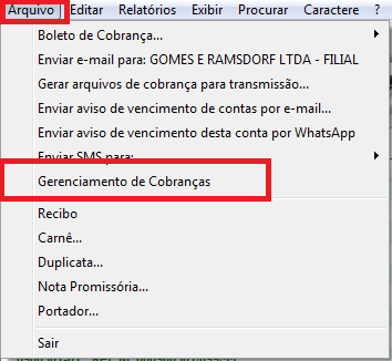 Em seguida, acesse Arquivo - Gerenciamento de cobranças.