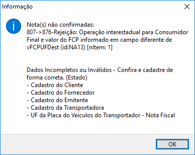 Rejeição: Operação interestadual para Consumidor Final e valor do FCP informado em campo diferente de vFCPUFDest