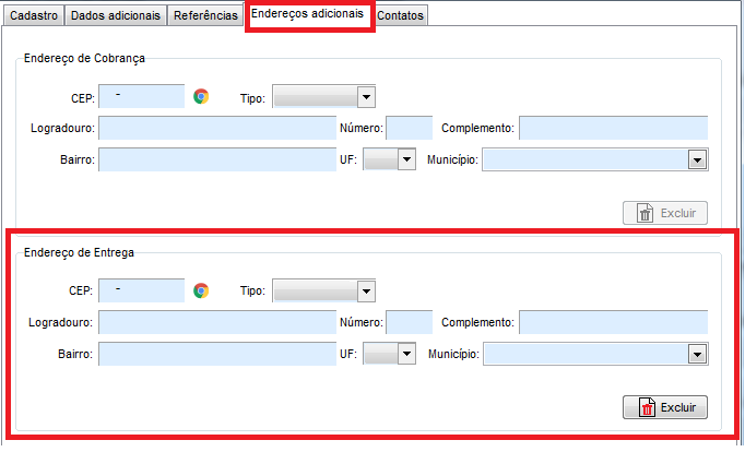Em seguida, clique na aba Endereços Adicionais e preencha o endereço do Emitente (seu endereço) no campo Endereço de Entrega.