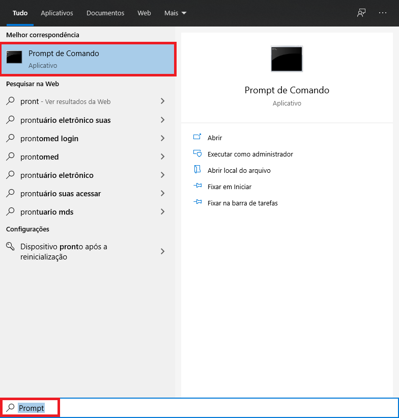 Clique no botão iniciar do Windows e digite Prompt, abra o Prompt de Comando (como administrador, clique com o botão direito para exibir essa opção).