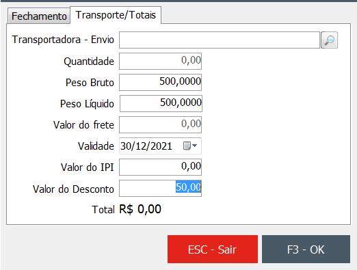Na aba Transporte/Totais é possível escolher a transportadora, quantidade, peso bruto/líquido valor do frete e validade. Além do valor do IPI e desconto Total do lançamento.