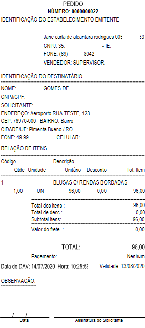 Após escolher o item que deseja, é possível escolher o Cliente, pressionando F9, que sairá impresso no comprovante.