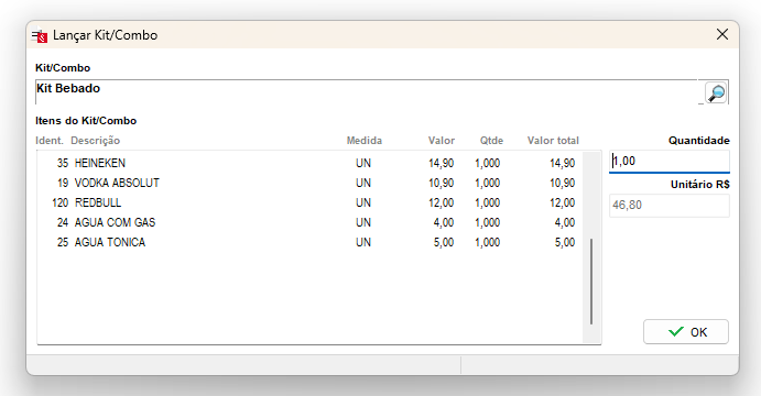 Também é permitido importar o um Kit para o Lançamento Rápido, basta pressionar a tecla INSERT, colocar o número do Kit, e pressionar OK.