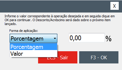 Para conceder desconto, pressione a tecla F8 ou clique na opção Desconto - F8. O descontoserá dado sobre o próximo item lançado e é possível lançar como porcentagem ou valor.