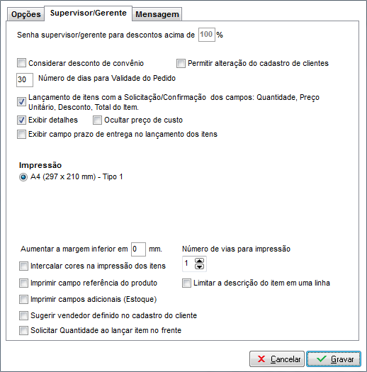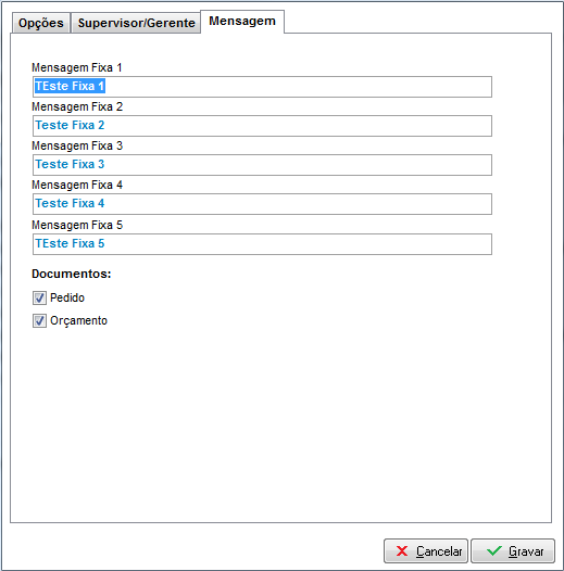 Na aba Mensagem é possível definir mensagens fixas que apresentarão nos pedidos ou orçamentos.