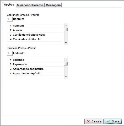 Na aba Opções é possível escolher a cobrança/parcelas padrão e também a situação padrão do pedido/orçamento, ou seja, cada pedido ou orçamento aberto trará por padrão essas informações.