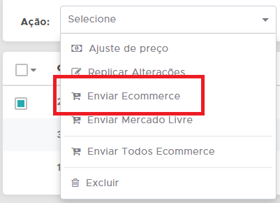 Para enviar os itens ao Ecommerce, acesse seu estoque, marque os itens que deseja enviar, clique em Ação - Enviar Ecommerce;