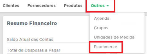 Para acessar seu ecommerce, clique em Cadastros - Outros - Ecommerce.