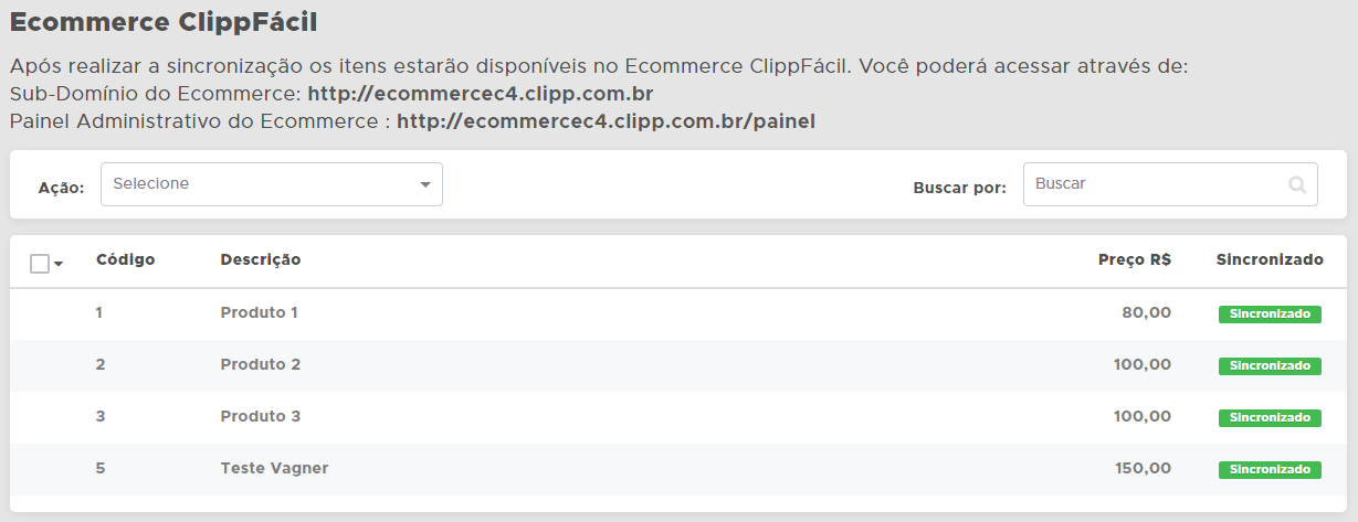 • Sincronizar: Envia os itens marcados para o Ecommerce.