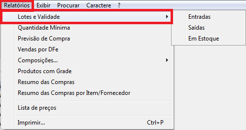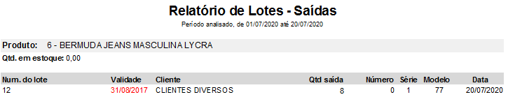 Quando o produto de lote estiver vencido, o mesmo será apresentado no relatório normalmente, porém, com a data na cor vermelha indicando o vencimento.