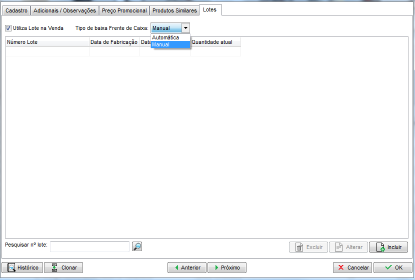 Para a opção Automática, sempre será baixada a quantidade do lote com a data de validade mais próxima, ou seja, o lote mais antigo.