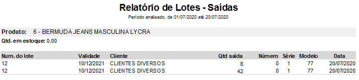 Serão listados no relatório, os lotes com as respectivas quantidades e as informações da nota de entrada/saída, sendo estas informações agrupadas por produto.