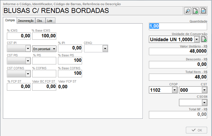 8. Ainda na tela do lançamento do item, informe os valores, quantidade, CST, CSOSN e os percentuais de ICMS, Base ICMS, IPI, PIS e Confins. Informe estes dados conforme nota do fornecedor ou solicite auxílio da contabilidade. Ao concluir o lançamento clique em OK.