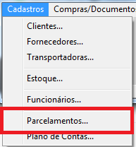 Para efetuar o cadastro acesse o menu de Cadastros e clique em Parcelamentos: