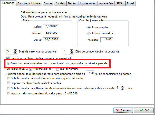 Para efetuar esta configuração acesse o Menu de Configurações – Parâmetros – Cobrança, marque a opção “Gerar parcelas a receber com o vencimento no mesmo dia da primeira parcela”:
