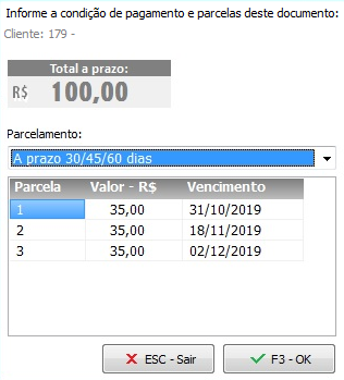 No Frente de Caixa, ao finalizar a venda selecionando a forma de pagamento “Prazo” por exemplo, será apresentada a tela para que seja selecionado o Parcelamento: