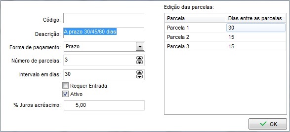 Utilizaremos o parcelamento de 30 / 45 / 60 dias, então, na Edição das Parcelas definiremos o dia entre as parcelas da seguinte forma: