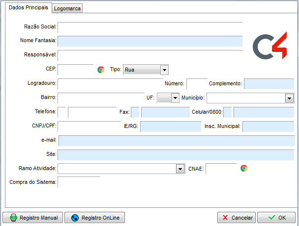 Registro Manual: Clicando nessa opção será gerado um documento com os dados da empresa e o mesmo deverá ser enviado para registro@compufour.com.br. Antes de enviar o documento certifique-se que os dados estão corretos.