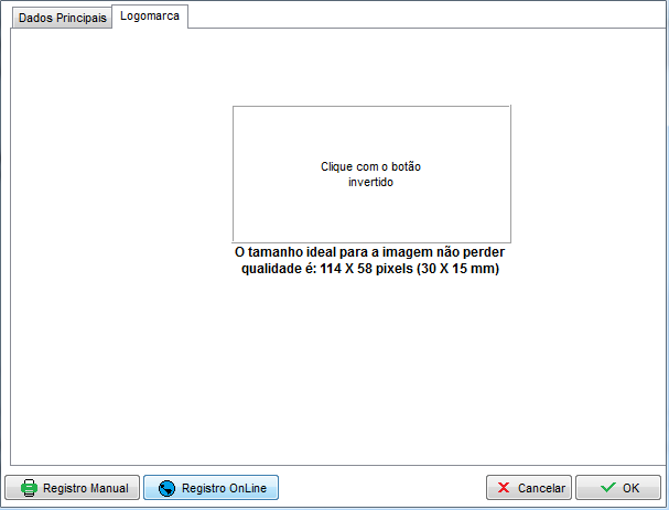 É possível utilizar a logomarca da empresa nos documentos e relatórios emitidos, para isso, clique com o botão direito do mouse no retângulo, em seguida clique em Procurar foto ou Capturar foto (webcam) para inserir a imagem. Lembrando que para imagem não perder qualidade sugerimos que o tamanho seja de 114 X 58 pixels (30 X 15 mm).