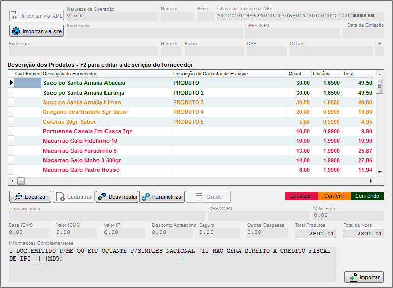 ♦ Depois de relacionar os produtos do estoque com os produtos do arquivo XML os mesmos ficarão na cor verde