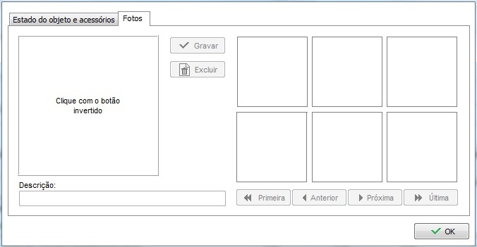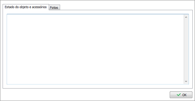 Durante o lançamento da OS, é possível inserir maiores detalhes referente ao objeto que foi entregue a empresa. Para isso, basta clicar no botão ao lado direito do campo Defeito Relatado, que em seguida será aberta uma janela com as abas Estado do Objeto e Acessórios e Fotos.