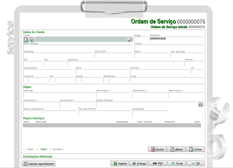 O módulo Atendimento tem como foco gerenciar o recebimento dos objetos. Portanto, o mesmo limita-se ao preenchimento das informações do cliente, do objeto e das informações adicionais, não tendo acesso ao lançamento de Peças e Serviços.