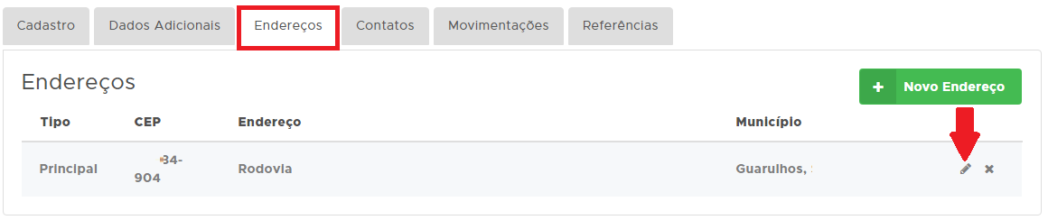 Localize o cliente da nota, abra seu cadastro, clique na aba Endereços e clique no lápis para edição: