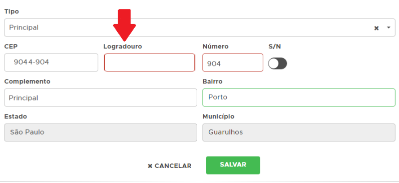 Possivelmente o Logradouro não estará preenchido, preencha e clique em salvar.