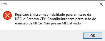 Rejeição: Emissor não habilitado para emissão da NFC-e: Contribuinte sem permissão de emissão de NFCe. Não possui MFE ativado
