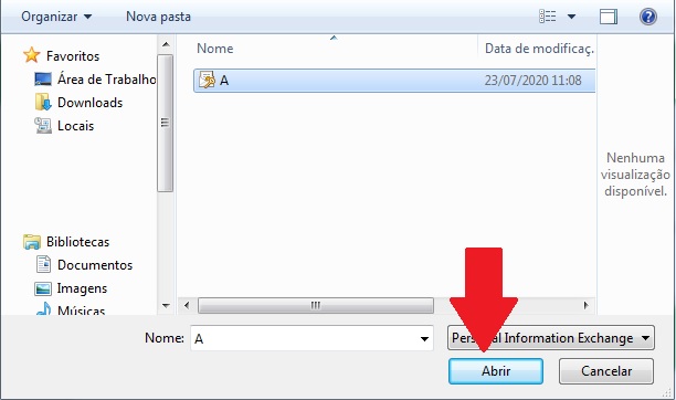 Abrirá a tela para escolher o certificado digital, clique sobre o mesmo e escolha a opção Abrir;
