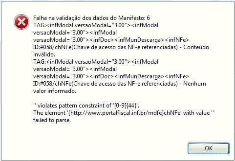 Falha na validação dos dados do Manifesto, TAG: < infModal="3.00" > (Chave de acesso das NF-e referenciadas)