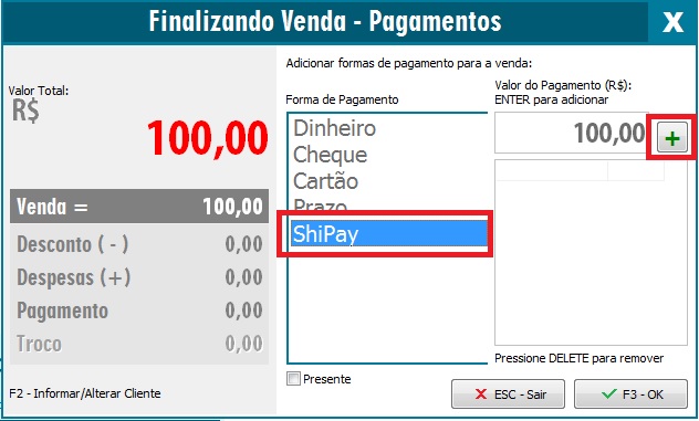 Na tela de forma de pagamento, selecione Shipay