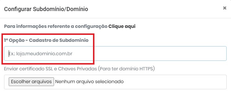 É necessário cadastrar o subdomínio (loja.exemplo.com.br). Se sua empresa vai utilizar apenas um subdomínio (loja.exemplo.com.br) deve fazer somente o apontamento do tipo CNAME do seu subdomínio para o nosso domínio (clipp.com.br), em seguida cadastrar no painel o subdomínio que vai utilizar.