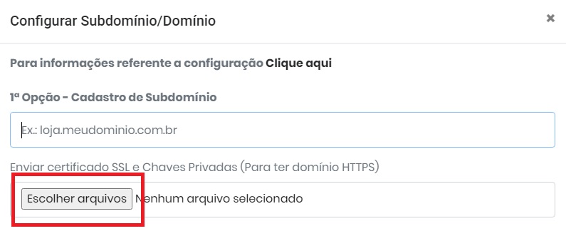 Após informar o endereço, é necessário selecionar o Certificado SSL, clique na opção Escolher arquivos;