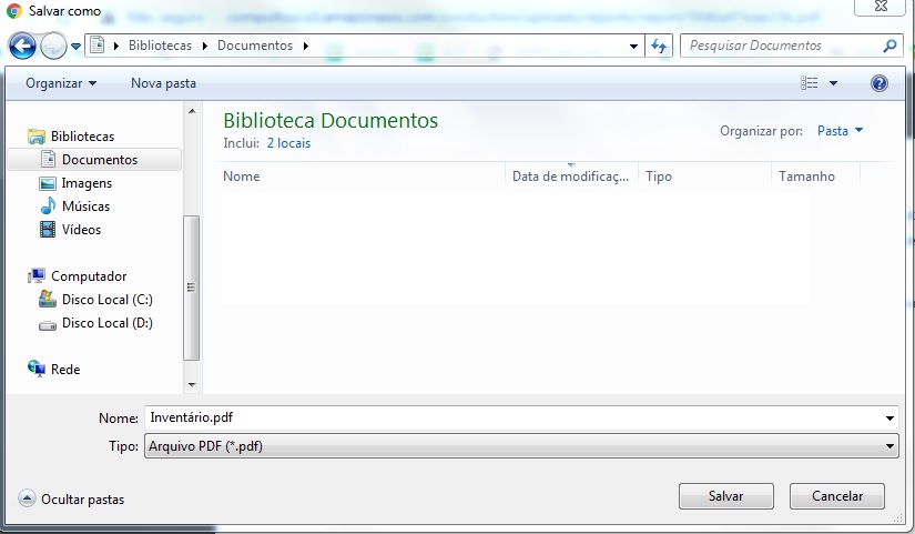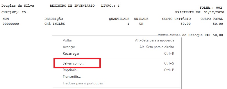 O Inventário será gerado em PDF em uma nova aba do navegador, clique com o botão direito na tela e escolha a opção Salvar Como;