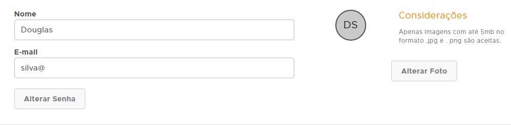 É possível alterar o Nome do perfil, e-mail principal e alterar a senha (necessário possuir a senha atual da conta para este procedimento). Logo ao lado, existe a possibilidade de importar uma imagem para o perfil, nos formatos .jpg e .png.