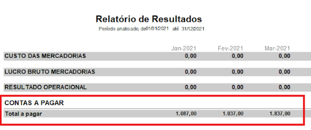 No Relatório de Resultados, temos disponível o valor relativo às contas a pagar. Esse valor é obtido considerando tudo o que você tem para pagar, independente da data de vencimento. Considera também a data da emissão do documento, buscando apenas documentos emitidos com data menor ou igual ao último dia do mês em questão. Busca também documentos pagos após o último dia do mês em questão, já que naquele momento, ainda não havia sido pago.