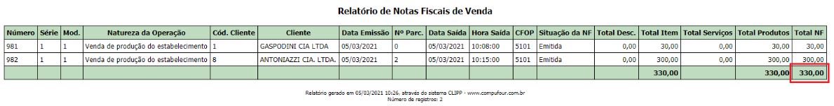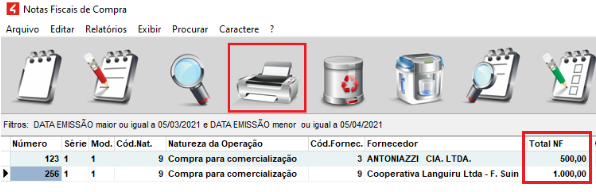 Filtrando as notas e pressionando F7, é gerado o relatório contendo os valores: