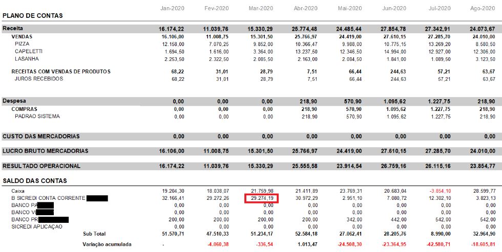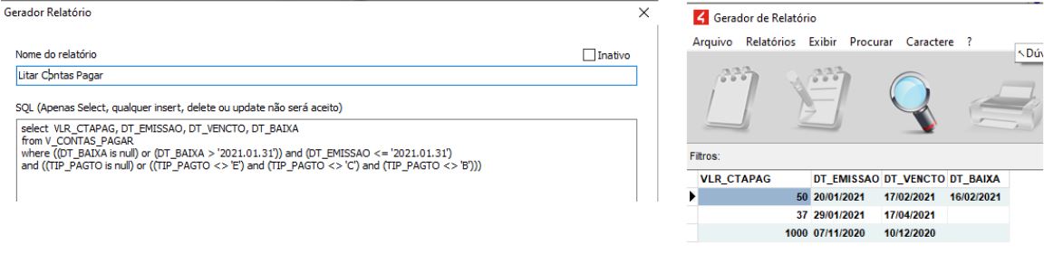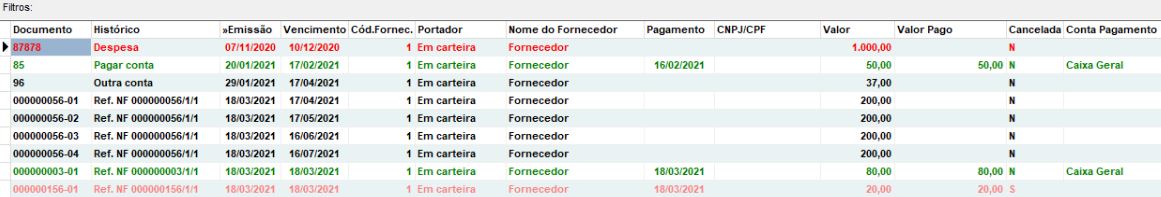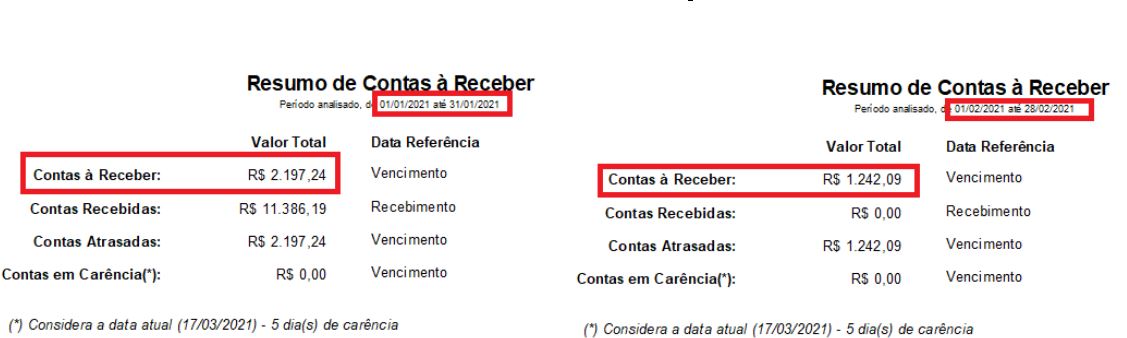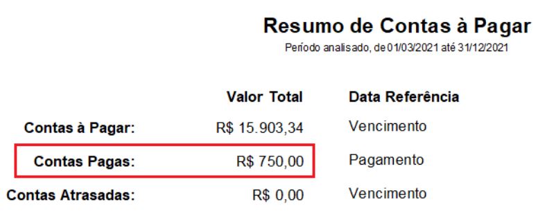 Importante notar que na imagem acima, foi listada uma conta paga, porém, ela foi paga apenas em 16/02/2021, e o período do relatório é referente a janeiro, então nesse momento, a conta ainda não havia sido paga.