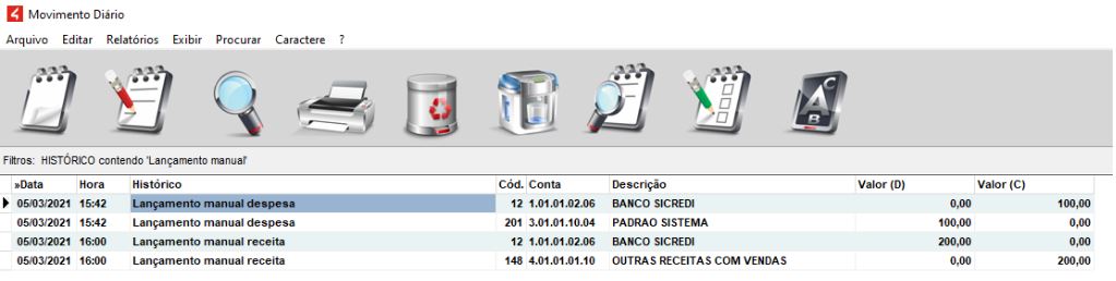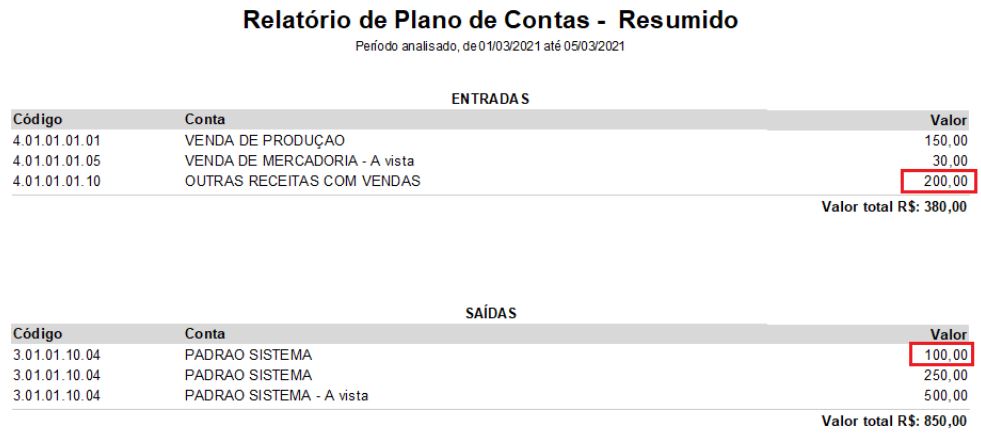 Podemos visualizar na imagem abaixo, o relatório gerado no Financeiro - Movimento diário - relatórios - Relatório - plano de contas resumido, com destaque nos valores relativos a lançamentos manuais: