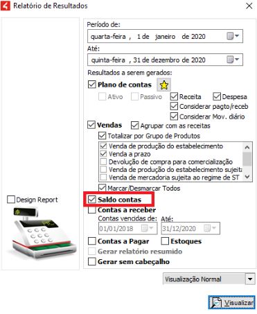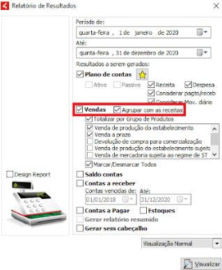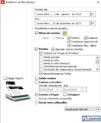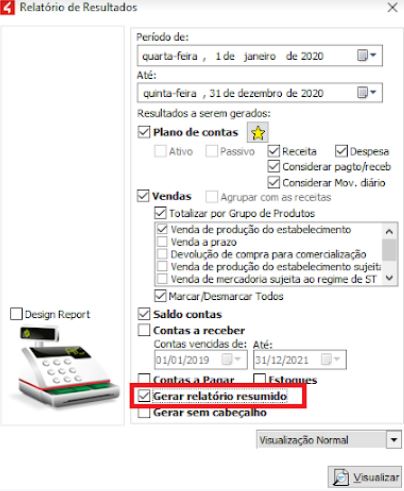 Além de gerar o relatório detalhado, é possível gerar também de forma resumida, onde as contas não são listadas, apenas totalizadas.