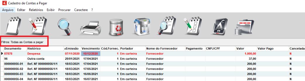 Podemos ainda verificar que o valor de R$ 1.837,00, que tem a pagar a partir do mês de março, pode ser visualizado filtrando as contas a pagar e gerando relatório no grid. Conforme visto abaixo: